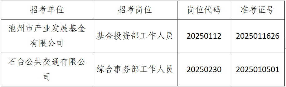 根據(jù)《池州市投資控股集團(tuán)2025年公開招聘工作人員公告》要求,由于入圍現(xiàn)場資格復(fù)審的考生中有部分人員自動(dòng)放棄或不合格產(chǎn)生了人員空缺,現(xiàn)按《公告》要求,在報(bào)考同崗位的考生中按筆試成績從高分到低分的順序依次遞補(bǔ),成績出現(xiàn)并列者一并進(jìn)入資格復(fù)審,現(xiàn)將入圍遞補(bǔ)資格復(fù)審情況公告如下: