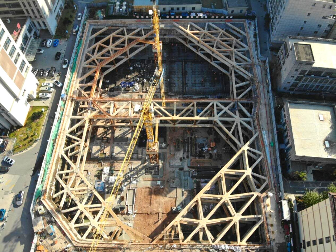 創(chuàng)新采用“旋挖樁+三層混凝土內(nèi)支撐”的復合支護體系。基坑平面尺寸達105.2米×81.9米,深度13.3—15.05米,設(shè)置支護樁279根、鋼立柱54根及三層混凝土內(nèi)支撐。針對雜填土區(qū)域富含地下水的情況,項目在支護樁間增設(shè)214根高壓旋噴樁,構(gòu)筑起一道可靠的截水帷幕,有效防止了基坑邊水土流失,保障了基坑穩(wěn)定與周邊建筑物安全。
