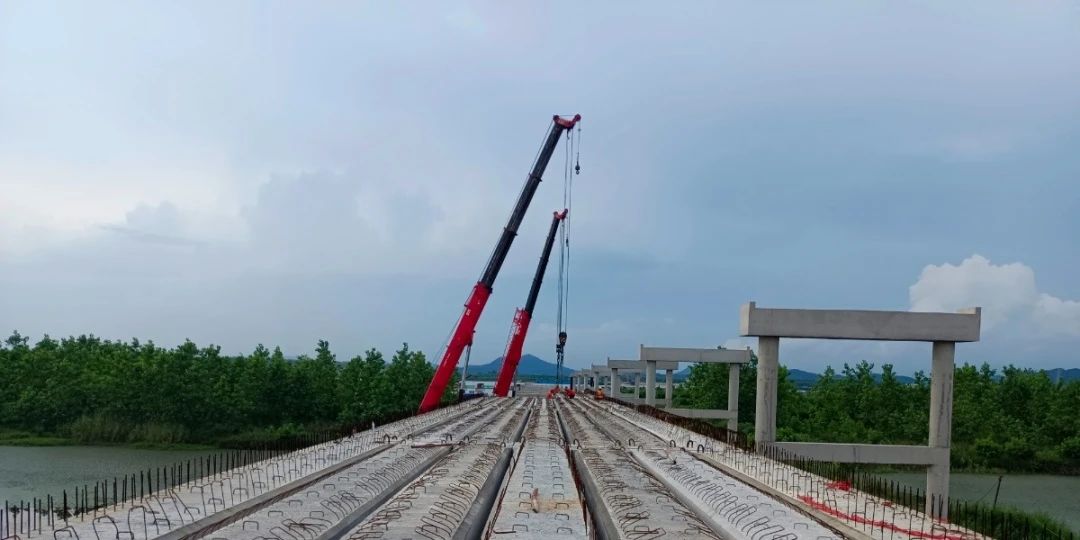 引橋空心板吊裝工程屬于超危大工程,本次空心板共計231塊,單塊空心板最大重量約30t,最大長度達到20m,為確保吊裝工作順利進行,前期完成了引橋預(yù)制空心板吊裝專項方案專家論證,通過對汽車吊等輔助工具的選擇及起重進行精準計算決定采用雙臺起重機配合吊裝的非常規(guī)起重方法,隨后,資運集團組織參建方對運輸進場道路進行了加固,組織吊裝單位對現(xiàn)場進行勘察,吊裝區(qū)域地基基礎(chǔ)處理等工作,以及吊裝前對相關(guān)人員進行了技術(shù)交底和安全教育。在吊裝現(xiàn)場,工作人員密切配合,準確的溝通和緊密的協(xié)調(diào),嚴格執(zhí)行吊裝方案,規(guī)范操作吊裝設(shè)備,順利完成了首次吊裝任務(wù),為后續(xù)安全高效吊裝積累寶貴經(jīng)驗。