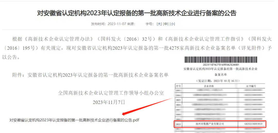11月7日,全國(guó)高新技術(shù)企業(yè)認(rèn)定管理工作領(lǐng)導(dǎo)小組辦公室發(fā)布《對(duì)安徽省認(rèn)定機(jī)構(gòu)2023年認(rèn)定報(bào)備的第一批高新技術(shù)企業(yè)進(jìn)行備案的公告》,池州市數(shù)據(jù)產(chǎn)業(yè)有限公司名列其中,榮獲2023年度第一批認(rèn)定的高新技術(shù)企業(yè)。