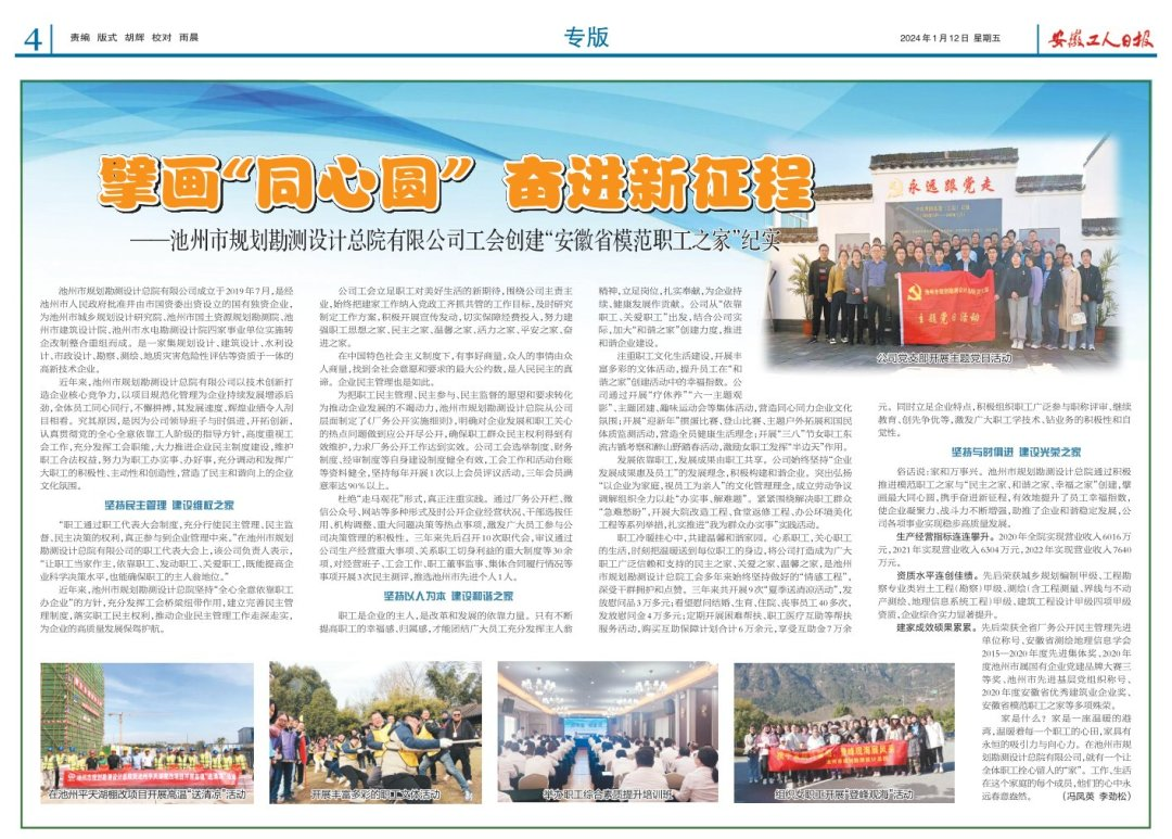 近年來(lái),池州市規(guī)劃勘測(cè)設(shè)計(jì)總院有限公司以技術(shù)創(chuàng)新打造企業(yè)核心競(jìng)爭(zhēng)力,以項(xiàng)目規(guī)范化管理為企業(yè)持續(xù)發(fā)展增添后勁,全體員工同心同行,不懈拼搏,其發(fā)展速度、輝煌業(yè)績(jī),令同行及世人刮目相看。究其原因,是因?yàn)楣绢I(lǐng)導(dǎo)班子與時(shí)俱進(jìn),開拓創(chuàng)新,認(rèn)真貫徹黨的全心全意依靠工人階級(jí)的指導(dǎo)方針,高度重視工會(huì)工作,充分發(fā)揮工會(huì)職能,大力推進(jìn)企業(yè)民主政治建設(shè),維護(hù)職工合法權(quán)益,努力為職工辦實(shí)事、辦好事,充分調(diào)動(dòng)和發(fā)揮廣大職工的積極性、主動(dòng)性和創(chuàng)造性,營(yíng)造了民主和諧向上的企業(yè)文化氛圍。
