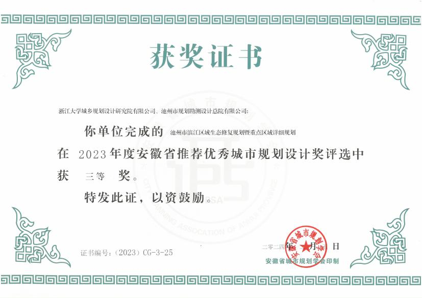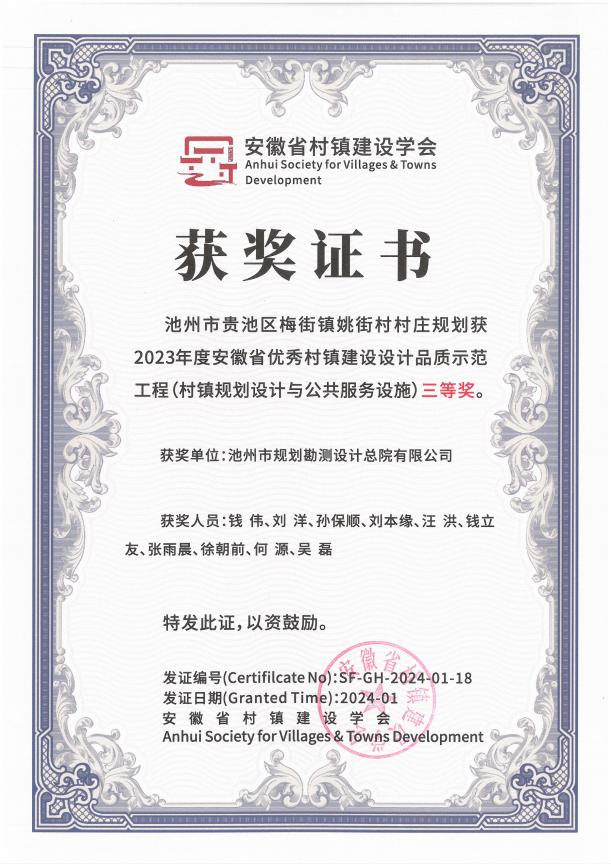 近日,安徽省村鎮(zhèn)建設(shè)學會和安徽省城市規(guī)劃學會分別揭曉了2023年度安徽省優(yōu)秀村鎮(zhèn)建設(shè)設(shè)計品質(zhì)示范工程和2023年度安徽省推薦優(yōu)秀城市規(guī)劃設(shè)計獎的獲獎名單。由集團所屬設(shè)計總院公司編制完成的《池州市貴池區(qū)梅街鎮(zhèn)姚街村村莊規(guī)劃》和《池州市濱江區(qū)域生態(tài)修復規(guī)劃暨重點區(qū)域詳細規(guī)劃》兩個項目分別榮獲2023年度安徽省優(yōu)秀村鎮(zhèn)建設(shè)設(shè)計品質(zhì)示范工程(村鎮(zhèn)規(guī)劃設(shè)計與公共服務設(shè)施)三等獎和2023年度安徽省推薦優(yōu)秀城市規(guī)劃設(shè)計獎三等獎。