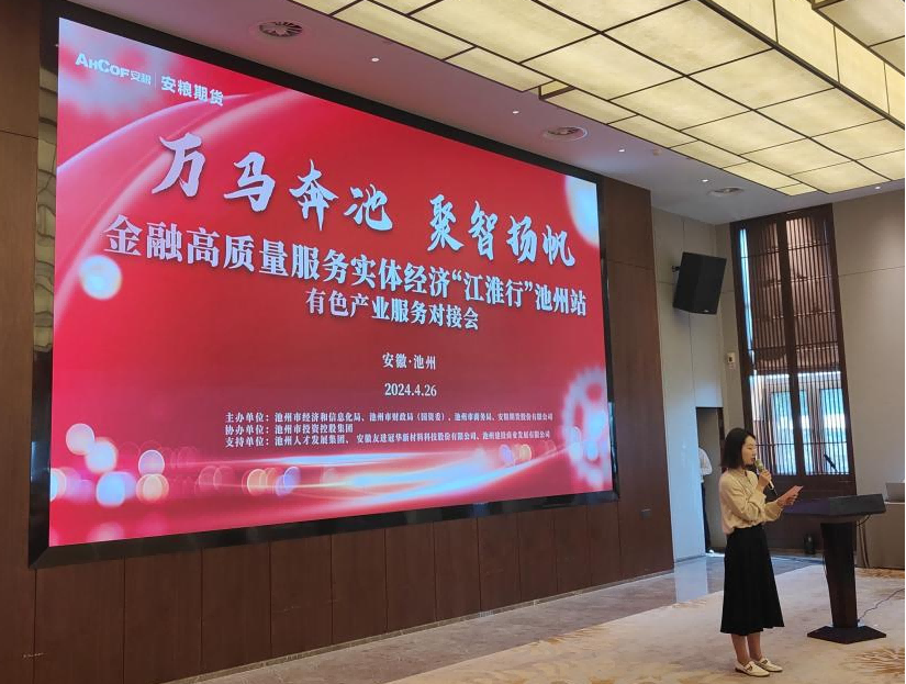 本次會議由池州市經(jīng)濟信息化局、池州市財政局(國資委)、池州市商務局、安糧期貨股份有限公司主辦,池州市投資控股集團協(xié)辦,安徽友進冠華新材料科技股份有限公司、池州建投商業(yè)發(fā)展有限公司提供支持,邀請了池州市鎂鋁銅相關企業(yè)及多家金融機構(gòu)代表參會。池州市商務局黨組書記、局長李進出席活動,池州市經(jīng)濟與信息化局副局長朱宇、安糧期貨董事長韓文輝先后致辭。